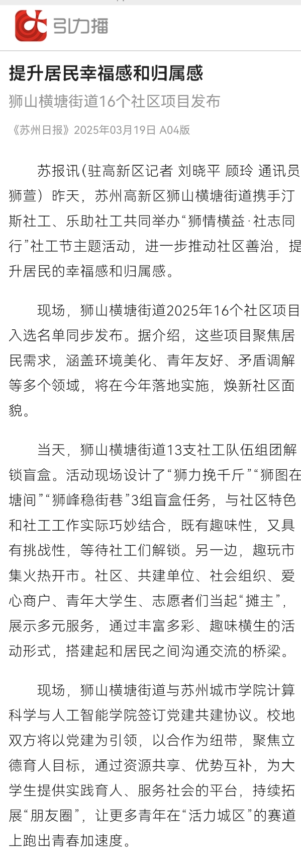 昨天,苏州高新区狮山横塘街道携手汀斯社工、乐助社工共同举办“狮情横益·社志同行”社工节主题活动,进一步推动社区善治,提升居民的幸福感和归属感。