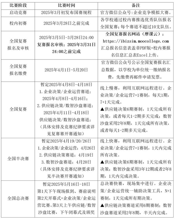 2025年全国企业竞争模拟大赛分校内初赛、全国复赛、全国半决赛、全国总决赛共四个阶段。全国总决赛地点:西南财经大学。为鼓励更多高校参赛,每所高校每个赛道复赛报名队伍数量不少于5支且复赛有效成绩第一的队伍保送进入决赛。