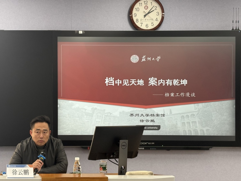苏州大学档案馆馆长徐云鹏以《档中见天地 案内有乾坤——档案工作漫谈》为主题,围绕档案是什么、如何更好地归档等方面,就归档标准、归档范围、归档注意事项等相关知识,通过结合苏州大学档案案例及馆藏档案情况,深入浅出地阐释档案的重要价值和档案工作的重要意义,进一步提升全校专兼职档案员的档案意识。