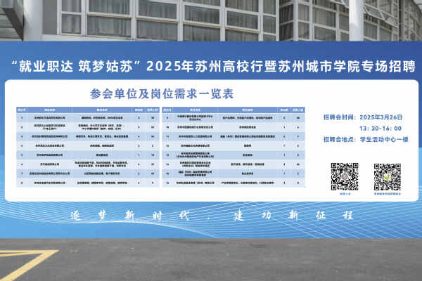 为深入贯彻落实党中央、国务院对高校毕业生就业创业工作的决策部署,以及省委、省政府、省教育厅党组的工作要求,畅通毕业生和用人单位双向沟通渠道,促进毕业生高质量就业。我校于3月26日下午在学生活动中心一楼举办“就业职达,筑梦姑苏”2025年苏州高校行暨苏州城市学院专场招聘会。