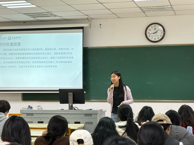 理论课上,汤月琴以“非遗的当代生命力”为切入点,系统讲解了中国古代导引养生的哲学基础与动作原理,从《黄帝内经》的“形神共养”到华佗五禽戏的仿生智慧,深入浅出地阐释了传统运动养生与现代健康理念的契合点。随后,她重点介绍了江南水乡特色非遗项目——连厢的历史渊源与文化内涵:“连厢融合了舞蹈、音乐与健身功能,其节奏韵律暗合中医经络学说,是非遗活化石也是动态养生经。”