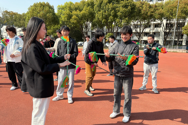移步操场实践环节,师生们手持缀满铜铃的连厢棒,在汤月琴的示范下学习“十字点打”等经典动作。这套动作通过肩、腰、膝、踝等关键部位的规律性敲击,配合“三拍一响”的节奏,能有效疏通经络、调和气血。“八方扫花”动作则通过横向扫动刺激腰部经络,“金钱滚地”通过足底震动激发身体活力。随着“嚓啷啷”的清脆声响,连厢棒在空中划出流畅弧线,传统非遗化作跃动的青春风景。参与学生王同学感慨:“没想到非遗还能这么‘潮’,每一棒都像是在和身体对话,很有文化味!”