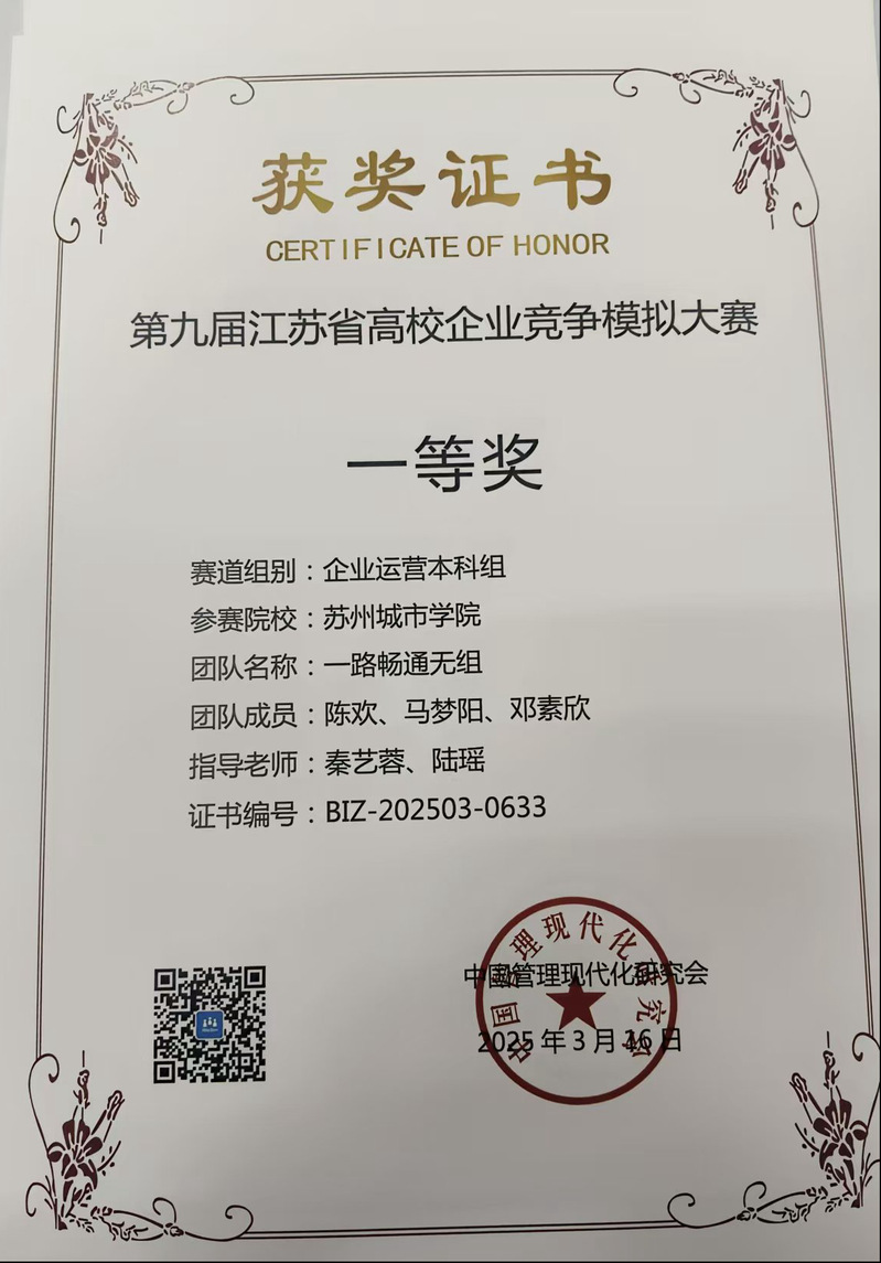 决赛阶段,我校参赛队伍创新运用自研Excel动态预测模型,实时调整市场策略。经过三天激烈角逐,最终在双赛道均取得突破性成绩:在BizWar赛道中6支队伍获奖,在iBizSim赛道中4支队伍获奖。这些成绩充分彰显了我校“以赛促教、以赛促学”人才培养模式的显著成效。学生将理论知识与实战决策深度融合,构建起数字化思维与商业运作能力。目前,获奖团队正携手新成员全力备战全国赛事,学校将持续深化“教——赛——创”协同育人机制,持续打磨企业运营与决策的全局把控力,为培养高素质应用型人才提供更优质的平台,力争在更高的平台展现苏州城市学院学子的风采。