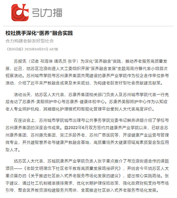 为深化“医养融合”实践,推动养老服务高质量发展,近日,姑苏区沧浪街道人大工委组织开展“医养融合发展”主题周周行暨代表小组首次视察活动。苏州城市学院与苏州康养集团共同建设的康养产业学院作为校企合作单位参与活动,介绍了近年来产教融合成果及未来规划,为构建老龄友好型社会贡献建言献策。