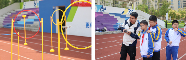 开幕式现场,学院科协学生团队进行无人机障碍穿越表演,同时指导现场中学生进行操作。