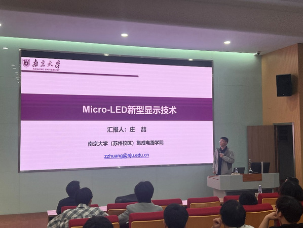 讲座中,庄喆教授从显示技术的发展历程切入,生动梳理了显示技术从LCD、OLED到Micro-LED的迭代历程。他通过对比分析,阐释Micro-LED在亮度、能效、寿命等方面的突破性优势,并结合AR/VR、柔性屏幕等应用场景,描绘其广阔市场前景。针对技术挑战,他聚焦巨量转移效率、全彩化工艺、材料可靠性等前沿课题,展示了学界与产业界的最新研究成果。此外,庄教授还展示了南京大学团队在Micro-LED显示方面最新的研究成果,激发学生探索热情。