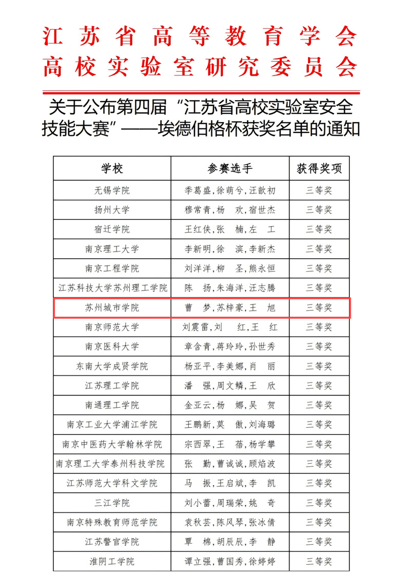 3月22日,由江苏省高校实验室研究会主办、常州大学承办、江苏埃德伯格电气有限公司协办的第四届江苏省高校实验室安全技能大赛在常州大学科教城校区举行。大赛吸引了省内的66所高校、近200名教师参赛,每个高校3名选手通过“快速作答”“沉浸式比赛”等考核形式展开角逐。我校由王旭、苏梓豪和曹梦三位老师组成代表队参加了本次大赛,并荣获三等奖。