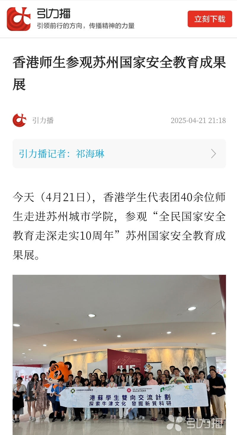 今天(4月21日),香港学生代表团40余位师生走进苏州城市学院,参观“全民国家安全教育走深走实10周年”苏州国家安全教育成果展。