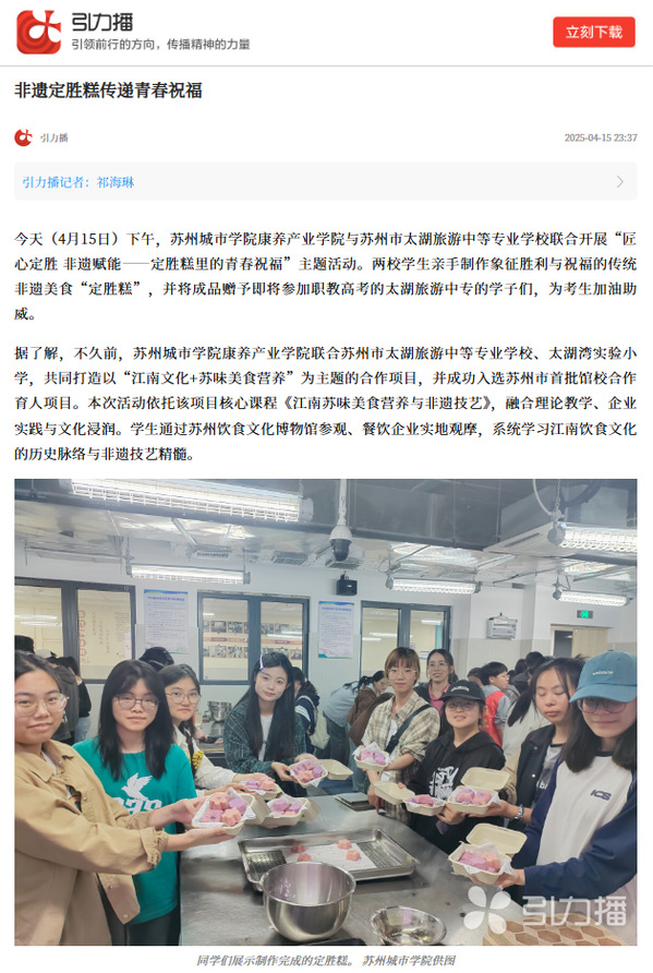 今天(4月15日)下午,苏州城市学院康养产业学院与苏州市太湖旅游中等专业学校联合开展“匠心定胜 非遗赋能——定胜糕里的青春祝福”主题活动。两校学生亲手制作象征胜利与祝福的传统非遗美食“定胜糕”,并将成品赠予即将参加职教高考的太湖旅游中专的学子们,为考生加油助威。