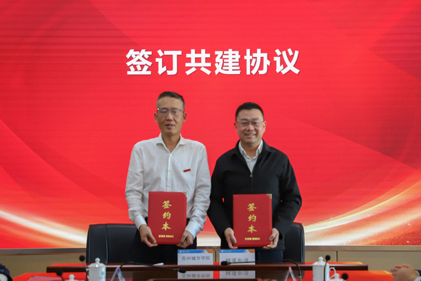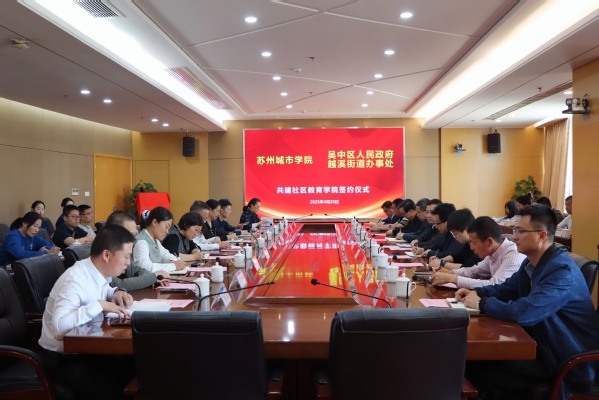 4月25日下午,苏州城市学院与吴中区人民政府越溪街道办事处共建社区教育学院签约仪式在校综合楼三楼大会议室隆重举行。校党委常委、副校长黄涧秋,越溪街道党工委副书记、办事处主任厉艺,吴中区教育局职业教育与社会教育科科长刘继端等领导出席活动,校地共同签署合作协议并为“城溪”社区教育学院揭牌,标志着校地协同推动社区教育发展迈入新阶段。