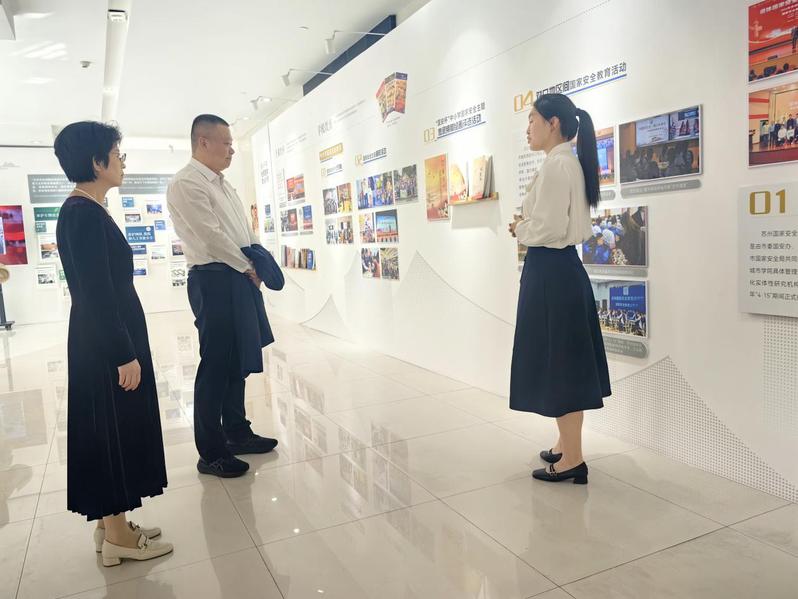正式座谈前,周玉玲等陪同叶桂平参观了位于我校大学生活动中心的“全民国家安全教育·走深走实十周年”苏州国家安全教育成果展,了解苏州各地、各部门十年来在开展国民安全教育方面取得的成果。
