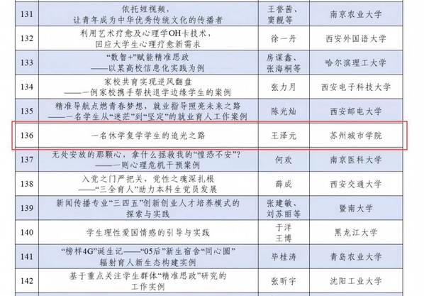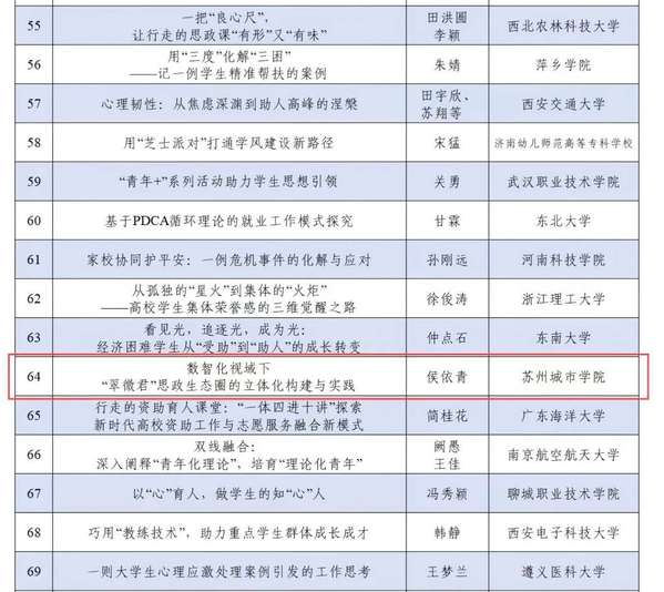 活动自启动以来,经过个人申报、学校推荐、形式审查与专家评审等环节,最终遴选出“百佳”论文、“百佳”案例及若干篇优秀论文、优秀案例。我校侯依青老师的工作案例《数智化视域下“翠微君”思政生态圈的立体化构建与实践》和王泽元老师的工作案例《一名休学复学学生的追光之路》成功入选优秀案例。