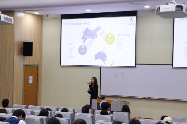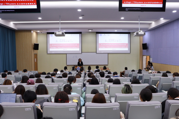 仪式后,潘亦从行业视角为在场师生带来主题为招聘实战分享会-招聘管理在TOP级外资人才解决方案供应商中的实操分享。她详细介绍美钛技术服务公司的全球化布局与美钛公司的核心业务,并围绕“招聘的价值与意义”“技术人才招聘流程”“人力资源测评方法”等主题展开深度解析。通过案例分析与经验总结为学生们揭示了数字化时代人才能力模型与职业发展路径,帮助其更清晰地规划未来方向。