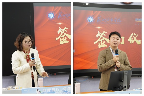 仪式伊始,解燕书记致辞,她表示:此次合作是学校深化产教融合、推进应用型高校建设的重要举措。新希望双喜乳业作为行业领军企业,合作将为我院学生提供更多优质实践平台,助力他们将理论转化为实践能力,成长为符合社会需求的复合型人才。