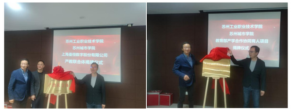 艺术与创意设计学院院长姜竹松、曼恒数字苏州区域总负责人程刚、建筑工程与艺术设计学院院长王迪为“产教联合体”和“教育部产学合作协同育人项目”揭牌。