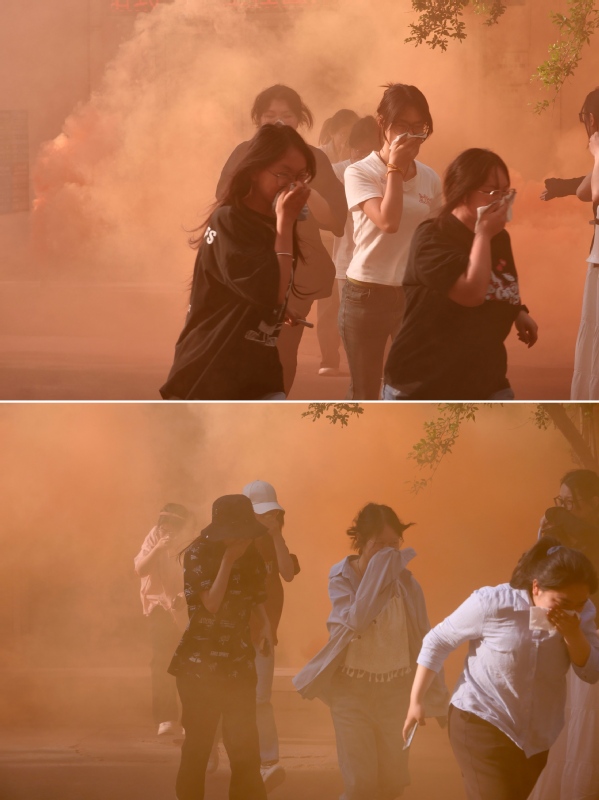 伴随急促的警铃声,消防疏散逃生演练拉开帷幕。听到警报声,学生们在疏散人员的指引下,用湿毛巾捂住口鼻,弯腰前行,井然有序地沿着逃生路线撤离到安全区域。