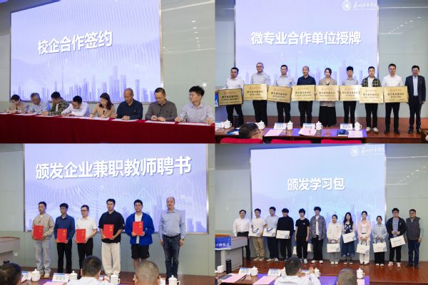 仪式上,校企双方进行现场签约;校方为微专业共建单位授牌、为企业兼职教师颁发聘书、为微专业学生颁发学习包。