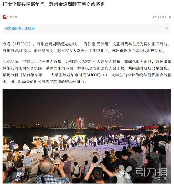 活动现场,主舞台以金鸡湖为背景、苏州文化艺术中心大剧院为幕布、湖面花船为道具,营造出如梦如幻的江南水乡氛围。乘兴而来的市民、游客以及各国嘉宾齐聚于此,共同感受这场文旅盛宴。暖场节目《姑苏繁华颂——大学生数戏华章时尚SHOW》中,大学生们身着传统与现代融合的服饰,通过时尚秀的形式展现了苏州的繁华与魅力。