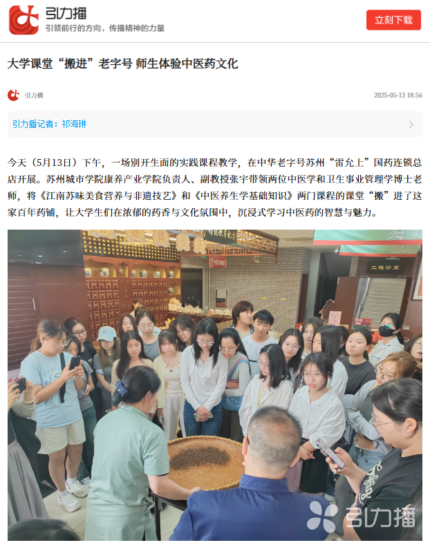 今天(5月13日)下午,一场别开生面的实践课程教学,在中华老字号苏州“雷允上”国药连锁总店开展。苏州城市学院康养产业学院负责人、副教授张宇带领两位中医学和卫生事业管理学博士老师,将《江南苏味美食营养与非遗技艺》和《中医养生学基础知识》两门课程的课堂“搬”进了这家百年药铺,让大学生们在浓郁的药香与文化氛围中,沉浸式学习中医药的智慧与魅力。