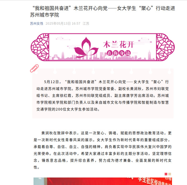 5月12日,“我和祖国共奋进”木兰花开心向党——女大学生“聚心”行动走进苏州城市学院。苏州城市学院党委常委、副校长黄涧秋,苏州市妇联党组书记、主席徐红霞,苏州市妇联党组成员、副主席唐学芳出席活动。苏州城市学院相关学院和部门负责人以及来自城市文化与传播学院和智能制造与智慧交通学院的200位女大学生参加活动。