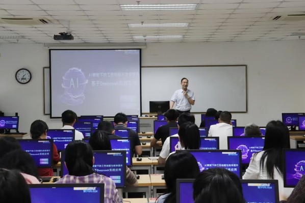 在人工智能技术加速迭代、教育变革深入发展的背景下,为全面提升学校科级干部人工智能素养,成为“懂AI、会AI、用AI”的高素质干部,5月26日下午,我校“文正学堂”科级干部第一次集中培训“AI赋能下的工作创新与效率提升——基于DeepSeek在高校工作中的应用”在学校机房正式拉开帷幕,全校科级干部参加培训。
