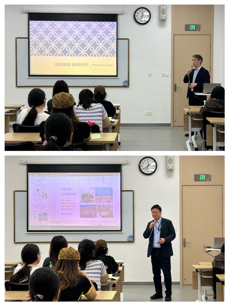 5月12日晚,日本北陆大学国际交流中心课长付超一、课长辅佐Justin Tobias来校开展《日本北陆大学双学位及交换生项目宣讲会》,我校城市文化与传播学院日文系副教授许临扬、2024级日语专业全体学生参加。Justin Tobias就日语常用词汇及短语,为同学们作了生动开场。随后,付超一就日本国家概况、北陆大学概况、双学位及交换生项目、日本升学就业及生涯规划等方面内容作详细介绍。