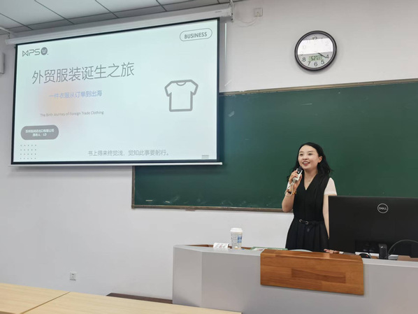 2025年5月27日下午,苏州恒润进出口有限公司业务经理李丹受邀来到苏州城市学院《进出口实务》课堂,为同学们带来了一场主题为“外贸服装诞生之旅”的专业讲座。此次讲座由该课程主讲教师陈天惠主持,旨在加强产教融合与校企合作,提升学生对进出口实务的认知与实践能力。