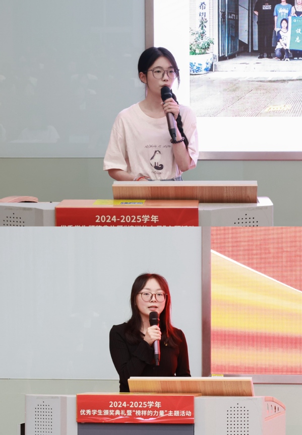 学校2025年学生标兵宣讲团成员徐红艳、施姝羽进行宣讲。徐红艳以“把青春种在祖国需要的地方”为主题,讲述其连续两年参与社会实践,分享用专业能力为地方赋能的深刻感悟,鼓励学弟学妹们心怀热爱,砥砺前行,激扬奋发向上的青春力量,彰显时代后浪的责任担当。施姝羽以“笃行致远,实干争先”为主线,分享其三年校园成长轨迹,鼓励青年勇于跳出舒适圈,将个人理想融入到服务同学、服务社会的伟大实践中,在奉献中解码青春密钥。