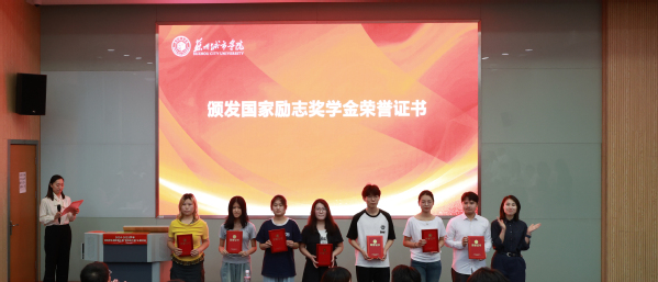 崔苏妍为国家励志奖学金获奖学生代表颁发证书。