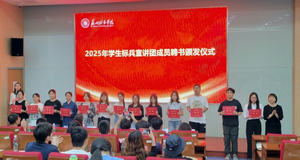 崔苏妍宣读成立苏州城市学院2025年学生标兵宣讲团的决定。祁素萍为宣讲团成员颁发聘书。