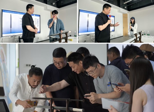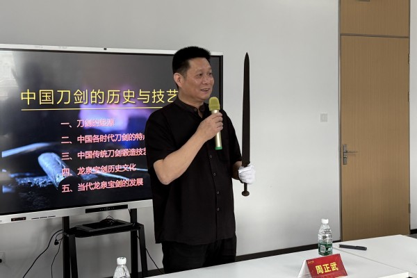 活动伊始,中国传统工艺大师、国家级非物质文化遗产——龙泉宝剑锻制技艺传承人周正武以“中国刀剑的历史与技艺”为主题展开讲解。他详细介绍了刀剑的起源、各时代刀剑特点、传统锻造技艺,重点讲述了龙泉宝剑的历史文化和当代发展。通过实物展示和生动讲解,周正武特别阐释了中国铁剑制造工艺的精髓、复原古剑的历史价值以及吴越两地的文化渊源。