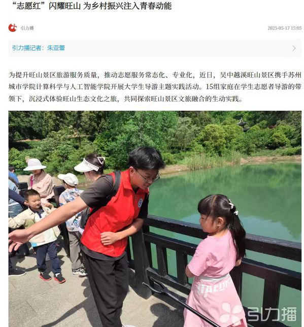 为提升旺山景区旅游服务质量,推动志愿服务常态化、专业化,近日,吴中越溪旺山景区携手苏州城市学院计算科学与人工智能学院开展大学生导游主题实践活动。15组家庭在学生志愿者导游的带领下,沉浸式体验旺山生态文化之旅,共同探索旺山景区文旅融合的生动实践。