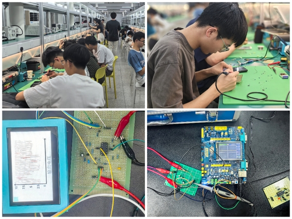 赛事吸引了计算科学与人工智能学院、光学与电子信息学院、智能制造与智慧交通学院三个学院共计45支队伍参赛。大赛以“简易电路特性测试仪”为赛题,模拟江苏省大学生电子设计竞赛初赛的形式进行比赛,包括电路设计、集中焊接调试、综合测评三个环节。各参赛小队于5月19日前完成电子元器件申请、采购以及电路设计,5月20日至5月21日,在机械实验楼301装配焊接实验室完成电路焊接以及调试,5月26日晚,在理工实验楼完成综合测评。最终,23书院(工科基地班)姚世泽、23微电子班申芳铭、23机电班邓涛小队在作品设计、焊接、综合测评中均表现优异,获得本届大赛一等奖。