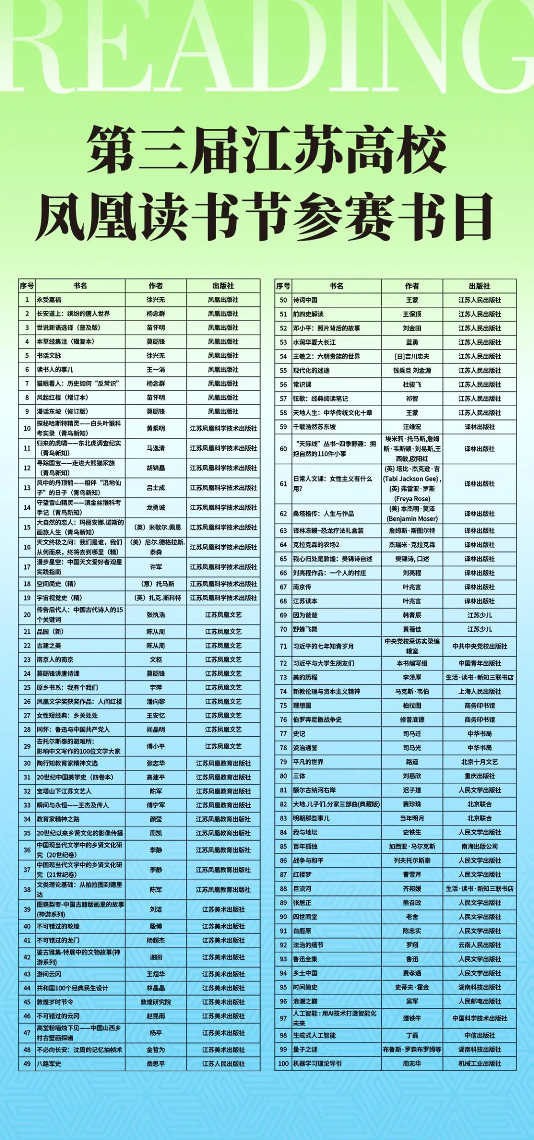为进一步学习贯彻党的二十大精神,倡导全民阅读新高潮,推动高校图书馆发挥阅读引领作用,弘扬中华优秀传统文化,激发大学生对深度阅读的关注,江苏省高等学校图书情报工作委员会、江苏省全民阅读促进会、江苏省书香全民阅读基金会、江苏凤凰出版传媒股份有限公司、江苏凤凰新华书店集团有限公司联合主办“书香润校园 阅读启智慧”第三届江苏高校凤凰读书节。