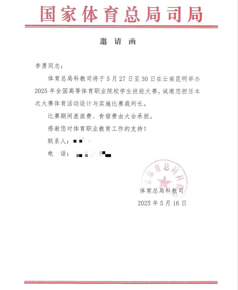 5月27日至30日,全国高等体育职业院校学生技能大赛“体育活动设计与实施”赛项在云南昆明成功举办。受国家体育总局邀请,我校基础教学部党委书记、主任李勇同志担任本次大赛裁判长。