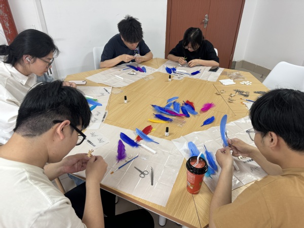 在深入了解点翠历史后,活动进入手工实践环节。辛老师详细演示了仿点翠的制作流程——剪出图案、上浆、粘贴和修剪、底胎涂胶、粘贴图案纸,同学们纷纷动手尝试,互帮互助,现场气氛热烈。