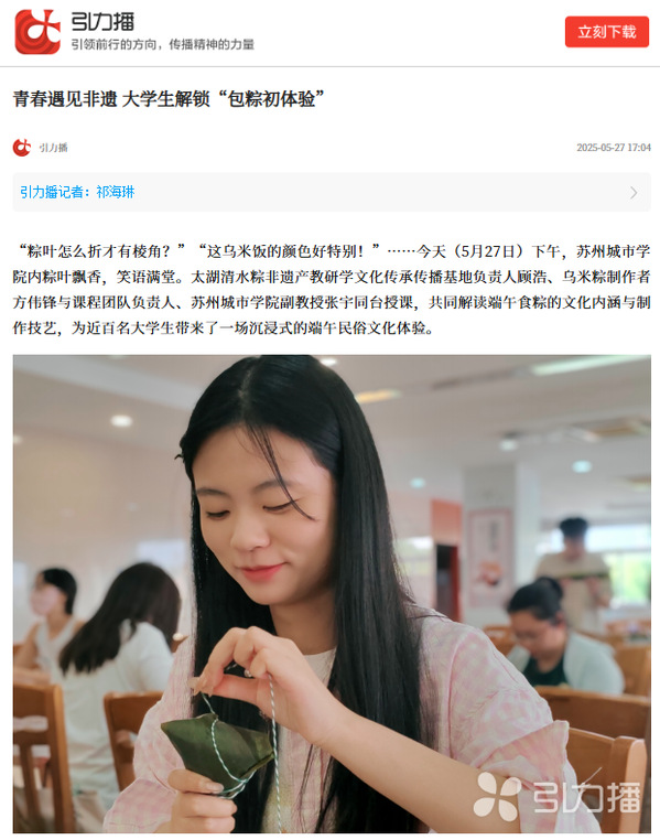 “粽叶怎么折才有棱角?”“这乌米饭的颜色好特别!”……今天(5月27日)下午,苏州城市学院内粽叶飘香,笑语满堂。太湖清水粽非遗产教研学文化传承传播基地负责人顾浩、乌米粽制作者方伟锋与课程团队负责人、苏州城市学院副教授张宇同台授课,共同解读端午食粽的文化内涵与制作技艺,为近百名大学生带来了一场沉浸式的端午民俗文化体验。