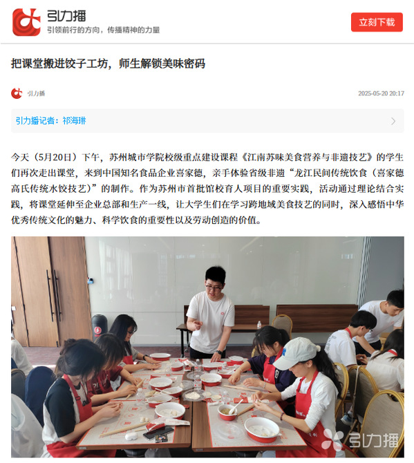 今天(5月20日)下午,苏州城市学院校级重点建设课程《江南苏味美食营养与非遗技艺》的学生们再次走出课堂,来到中国知名食品企业喜家德,亲手体验省级非遗“龙江民间传统饮食(喜家德高氏传统水饺技艺)”的制作。作为苏州市首批馆校育人项目的重要实践,活动通过理论结合实践,将课堂延伸至企业总部和生产一线,让大学生们在学习跨地域美食技艺的同时,深入感悟中华优秀传统文化的魅力、科学饮食的重要性以及劳动创造的价值。