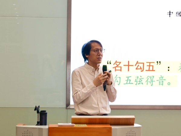 随后,唐明务选取经典诗词《关雎》《忆江南》进行演唱示范。他借助简谱翻译,把古谱诗词的音乐魅力直观地呈现在大家面前。在互动环节,唐老师随机邀请在场学生朗诵《关雎》,并深入解析其中君子与淑女爱情故事里克制与尊重的价值观,让同学们在文学品鉴与情感共鸣中,加深对诗词内涵的理解。