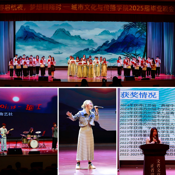 “回首过往,那些年华如歌、青春如画的日子历历在目。苏城文传,这片滋养我们梦想的沃土,见证了我们的成长与蜕变。”6月10日,“青春启航夜,梦想翱翔时”——城市文化与传播学院2025届毕业晚会在多功能厅倾情上演,特邀苏州城市学院党委学生工作部(学生工作处、人民武装部)副部(处)长祁素萍、团委(美育中心)副书记崔苏妍、城市文化与传播学院副院长陈国安、副院长涂小马、院长助理茆萌、青年干事孙兰镇、广告专业负责人王静、专业教师代表、毕业班班主任代表及全体辅导员参加,本场晚会为即将告别校园、踏上新征程的毕业生们带来了一场精彩纷呈的视听盛宴。