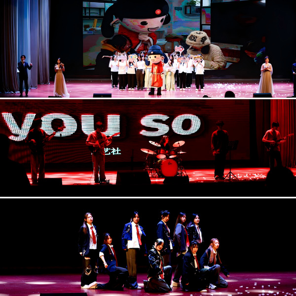 第三篇章“青衿远志·万里鹏翼”将晚会推向了高潮。曲艺社的乐队表演《I love you so》用温暖的旋律传递出对未来的美好期许;FID舞蹈协会的《咆哮》则以活力四射的舞姿,展现出毕业生们无畏前行的勇气与决心;最后,全体演职人员共同带来的歌曲合唱,将现场气氛推向了顶点,歌声中充满了对未来的憧憬与希望,也承载着对母校的感恩与眷恋。