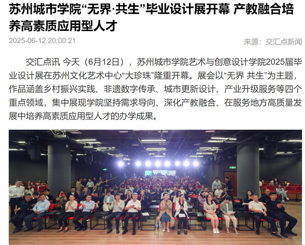 交汇点讯 今天(6月12日),苏州城市学院艺术与创意设计学院2025届毕业设计展在苏州文化艺术中心“大珍珠”隆重开幕。展会以“无界 共生”为主题,作品涵盖乡村振兴实践、非遗数字传承、城市更新设计、产业升级服务等四个重点领域,集中展现学院坚持需求导向、深化产教融合、在服务地方高质量发展中培养高素质应用型人才的办学成果。