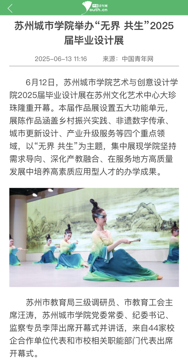 6月12日,苏州城市学院艺术与创意设计学院2025届毕业设计展在苏州文化艺术中心大珍珠隆重开幕。本届作品展设置五大功能单元,展陈作品涵盖乡村振兴实践、非遗数字传承、城市更新设计、产业升级服务等四个重点领域,以“无界 共生”为主题,集中展现学院坚持需求导向、深化产教融合、在服务地方高质量发展中培养高素质应用型人才的办学成果。