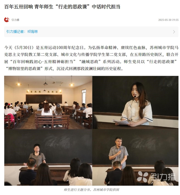 今天(5月30日)是五卅运动100周年纪念日。为弘扬革命精神、赓续红色血脉,苏州城市学院马克思主义学院教工第二党支部、城市文化与传播学院学生第二党支部,在五卅路历史街区,联合开展“百年回响践初心·五卅精神砺担当”“融城思政”系列活动。师生党员以“行走的思政课”“博物馆里的思政课”形式,沉浸式回溯那段波澜壮阔的历史征程。
