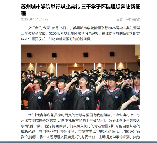 “铭记师长教诲,肩负时代使命!”3200余名学子右拳过肩,齐诵毕业誓词。“感恩母校赋予我‘创造温度’与‘成为光’的勇气!人生并非轨道而是旷野,我们将带着苏州城市学院熔铸于心的‘城院精神’、江南诗意浸润的‘人文温度’以及在无数挑战中练就的‘破浪前行之智’,向光而行、奔赴各自的星辰大海!”城市文化与传播学院毛馨的发言引发毕业生共鸣。