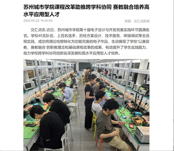 交汇点讯 近日,苏州城市学院第十届电子设计与开发竞赛实践环节圆满收官。学校45支队伍、上百名选手,历经方案设计、技术报告、焊接调试等全流程实践,成功将理论构想转化为功能完备的电子作品,生动展现了学校“以赛促教、赛教融合”的职教理念和基础课程改革的成果,有效提升了学生实践能力,助力学校跨学科协同创新纵深发展和高水平应用型人才培养。