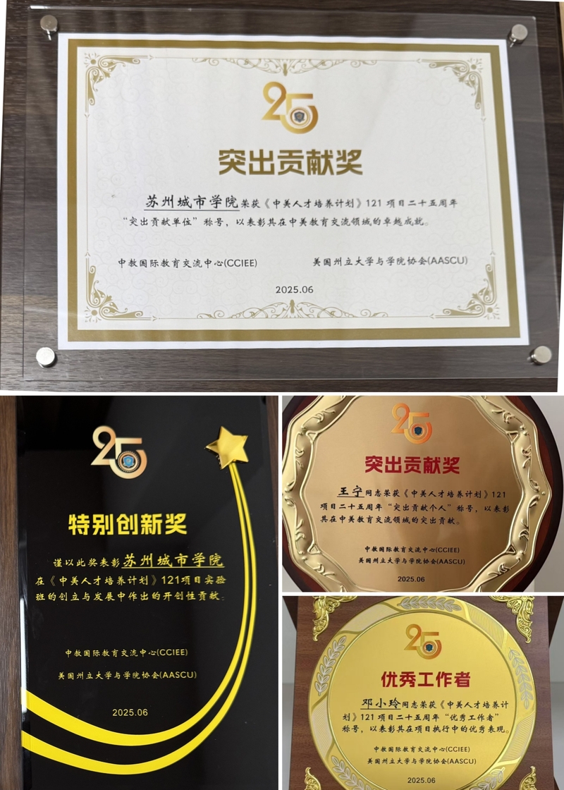 我校是最早一批加入《中美人才培养计划》121项目的中方院校之一,也是江苏省首批创新开展“中美学分互认联合培养项目”的院校之一,与中教国际一同见证了二十五年来项目的不断发展与进步。近十年来我校通过121项目累计派出240人赴北亚利桑那大学、鲍尔州立大学、乔治梅森大学等美国州立大学学习。94名项目毕业生升入世界排名前200的世界名校攻读硕士,占该项目赴美留学人数的39.1%。我校与广东财经大学、华侨大学等6所高校在121项目实验班的创立与发展中做出了开创性贡献,获得了由中教国际教育交流中心和美国州立大学与学院协会共同颁发的“特别创新奖”,除此之外我校还被评为《中美人才培养计划》121项目“突出贡献单位”,王宁和邓小玲分别获得“突出贡献个人”和“先进工作者”称号。