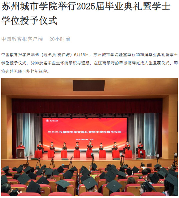 6月15日,苏州城市学院隆重举行2025届毕业典礼暨学士学位授予仪式,3200余名毕业生怀揣学识与理想,在江南学府的翠微湖畔完成人生重要仪式,即将奔赴无限可能的新征程。