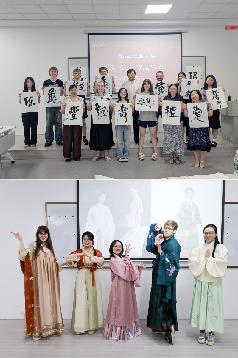 为全面展现中国传统文化魅力, 我校于6月15日上午精心安排了“中国书法”与“汉服文化”两个讲座。我校书法研究院院长王学雷从中国书法发展史、传统书写工具讲起,深入浅出地讲解了书法艺术精髓,并特别介绍了苏州这座历史文化名城与中国书法的深厚渊源。王院长即席挥毫,现场演示了中国“福”字不同字体的写法,引得在场师生连连赞叹。我校汉服社的同学身着汉服,通过PPT系统地展示了中国历代汉服的特点与风格,并邀请美国师生共同体验。在墨香氤氲中,美方师生提笔挥毫,领略汉字书写的气韵之美;在宽袍广袖间,他们身着汉服,亲身体验华夏服饰礼仪之雅,进一步加深了对中华文明的理解与认同。