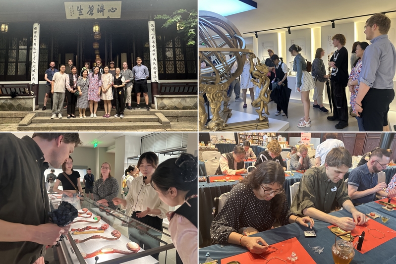 为强化文化感知,14日下午,两校师生前往古城“32号街坊”展开实地参访。在中医馆“雷允上”,师生们领略了传统中医药文化的博大精深;在古典园林“畅园”,师生们解读了中式园林“师法自然”的哲学意蕴与造园智慧;时钟博物馆内,古老的计时仪器无声诉说着中国古人的科学探索精神;漆器艺术馆中,流光溢彩的漆艺珍品展示了这项国家级非物质文化遗产的传承与创新之美。最令师生兴奋的是螺钿镶嵌工艺体验环节,大家亲手将贝壳薄片嵌入漆胎,在一琢一磨间深刻感受到东方匠人追求极致的“匠心”精神。